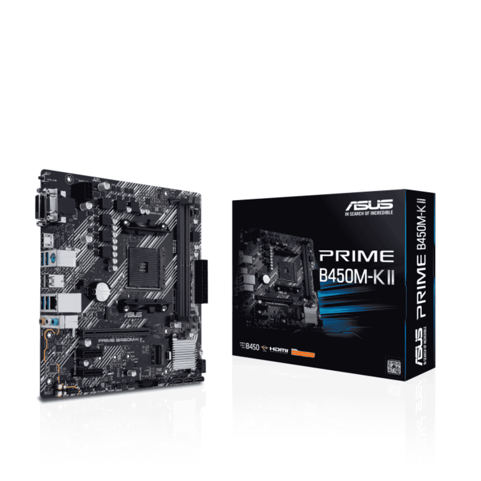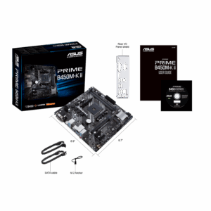The ASUS PRIME B450M-K II is a reliable micro-ATX motherboard built on the AMD B450 chipset, supporting a wide range of Ryzen™ processors through the AM4 socket. Its efficient layout and robust power delivery make it a solid choice for mainstream desktops, offering compatibility with high-performance CPUs and fast DDR4 memory. Designed for stability and longevity, it includes quality components and ASUS 5X Protection III safeguards to ensure durable, everyday computing.