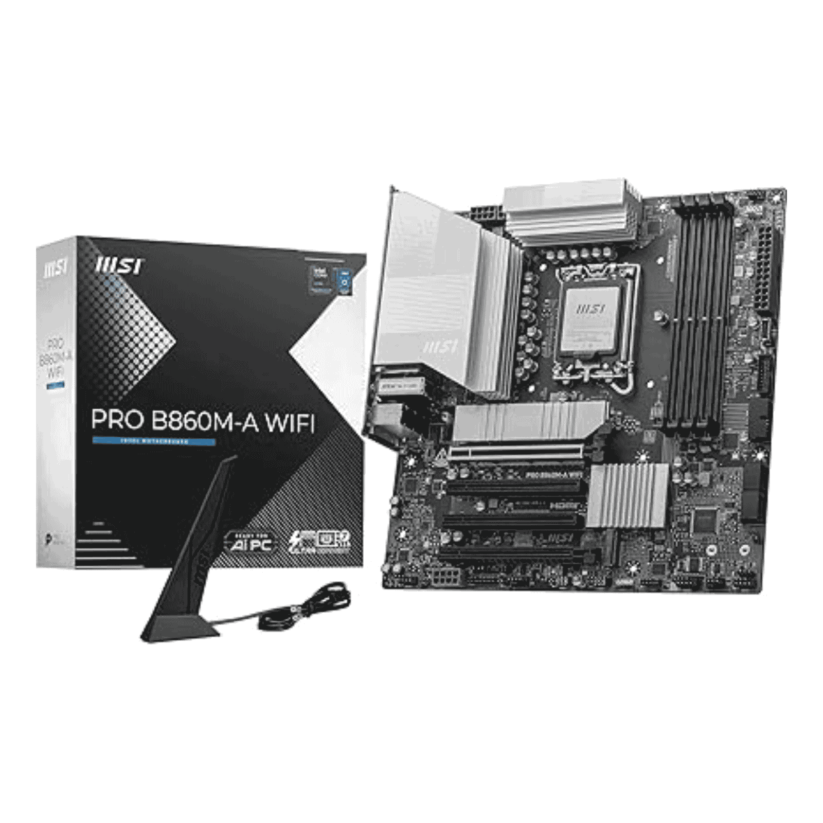 The MSI PRO B860M-A WIFI is built on the Intel B860 chipset and the latest Intel 1851 socket, providing a solid foundation for modern desktop computing. Supporting DDR5 memory with overclocking up to 8800MT/s, Intel XMP 3.0, and JEDEC speeds, this motherboard ensures high-speed and stable performance for productivity, multitasking, and professional workloads. Its efficient power design and compatibility with next-generation Intel CPUs make it a strong choice for users seeking reliability and long-term upgrade potential.
