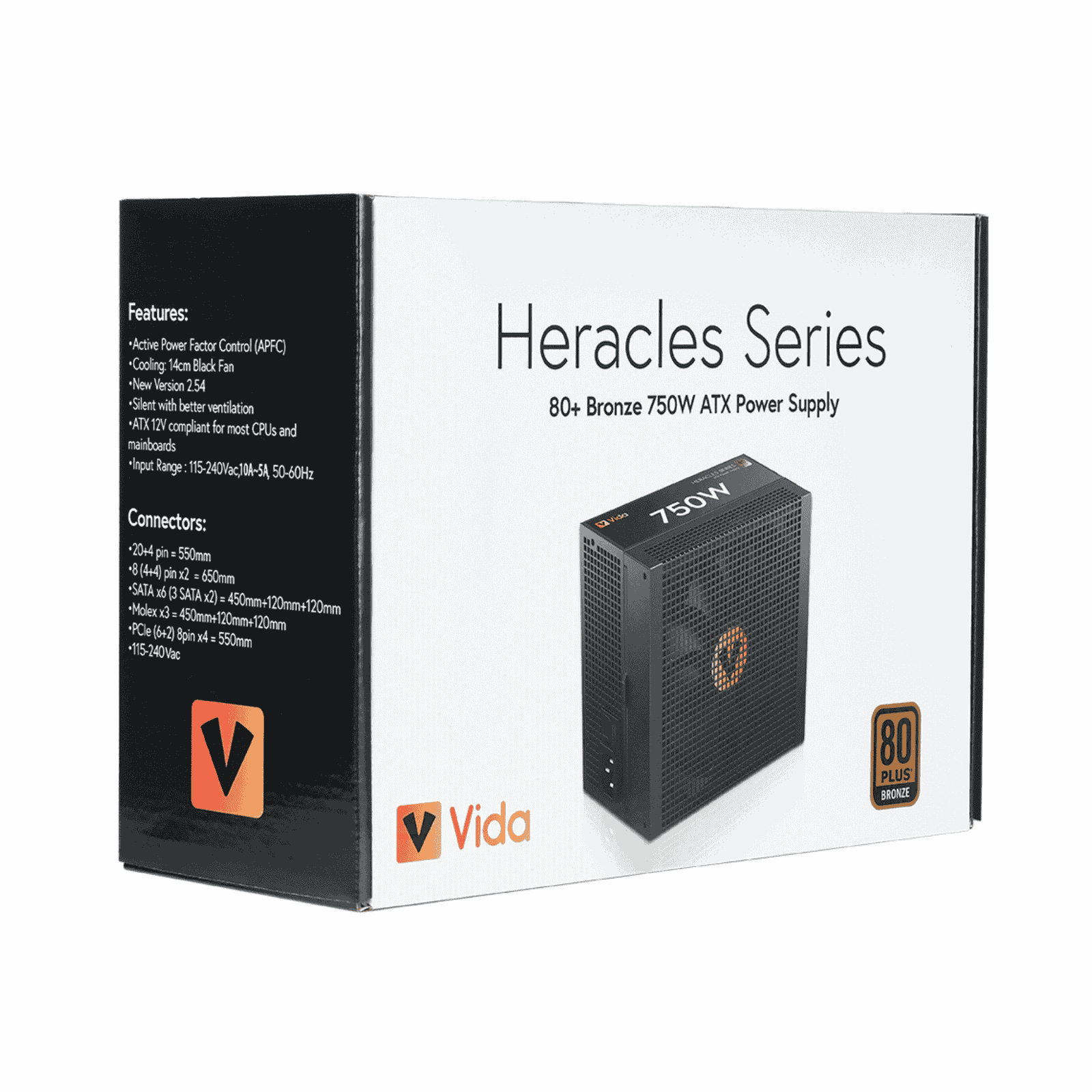Designed with a fully wired configuration and flat black cables, the Vida 750W Heracles PSU combines practicality with aesthetics. It includes multiple connectors for SATA, PCIe, and CPU power, offering flexibility for various components. With robust protections such as OVP, OCP, OTP, and more, plus a 2-year warranty, this power supply provides peace of mind, stability, and durability for all your gaming adventures.