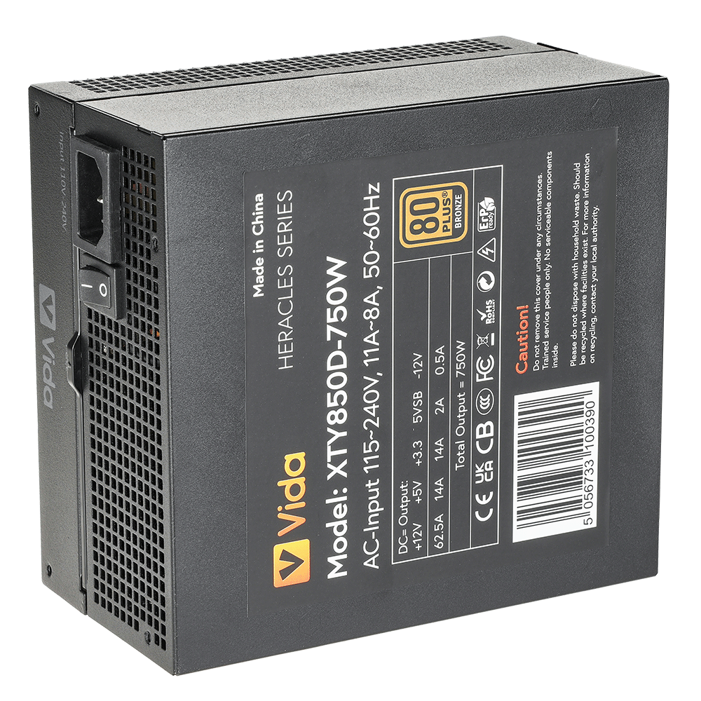 Vida 750W Heracles Black ATX Gaming PSU, 80+ Bronze, 140mm Ultra-Quiet FDM Fan, Flat Black Cables, Power Lead Not Included