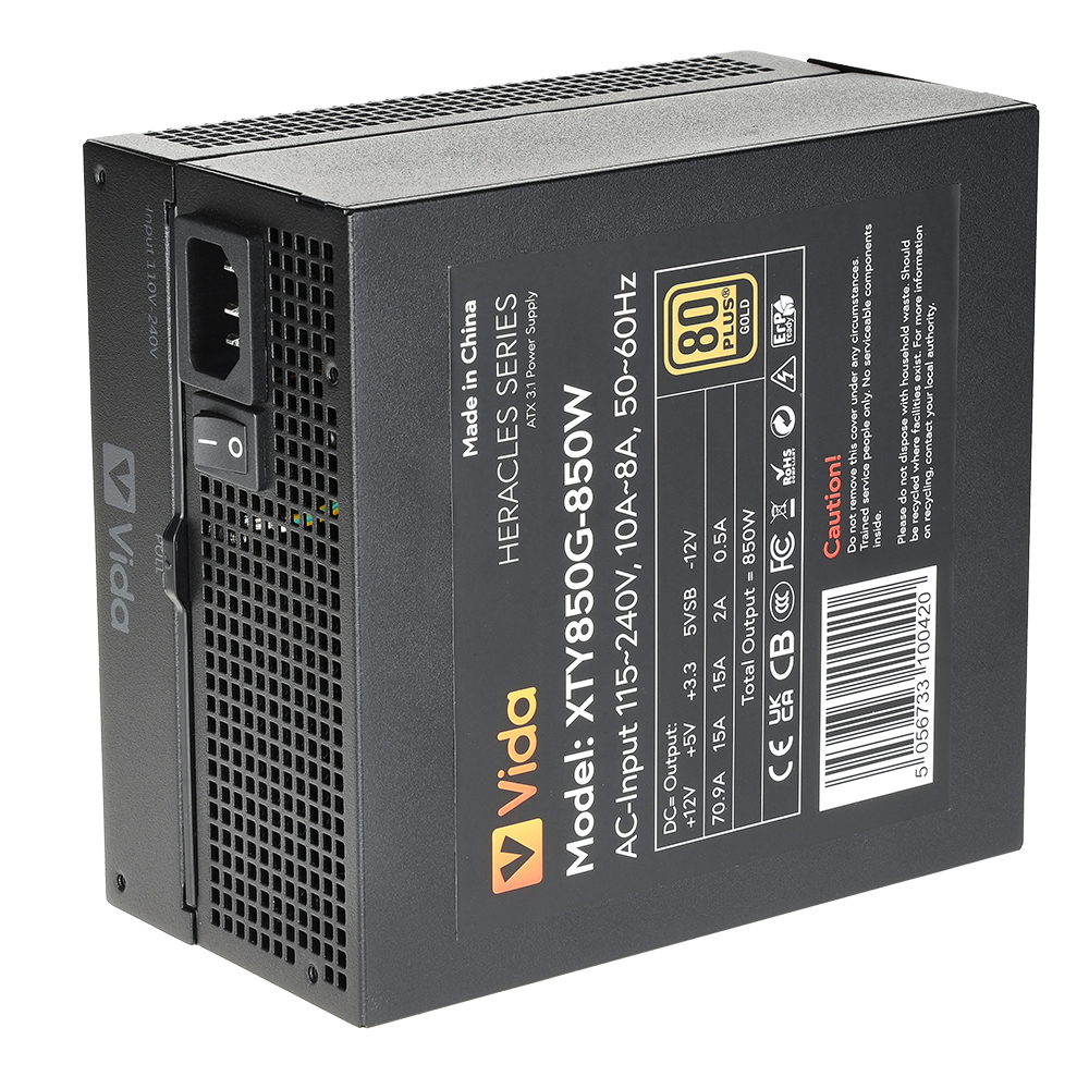 Vida 850W Heracles Black ATX 3.1 Gaming PSU, 80+ Gold, Fully Modular, 140mm Ultra-Quiet Semi-Fanless FDM Fan, Flat Black Cables, PCIe 5.1, Power Lead Not Included